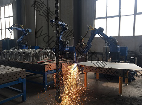 焊接機(jī)器人進(jìn)行不銹鋼板弧形焊接坡口切割...
